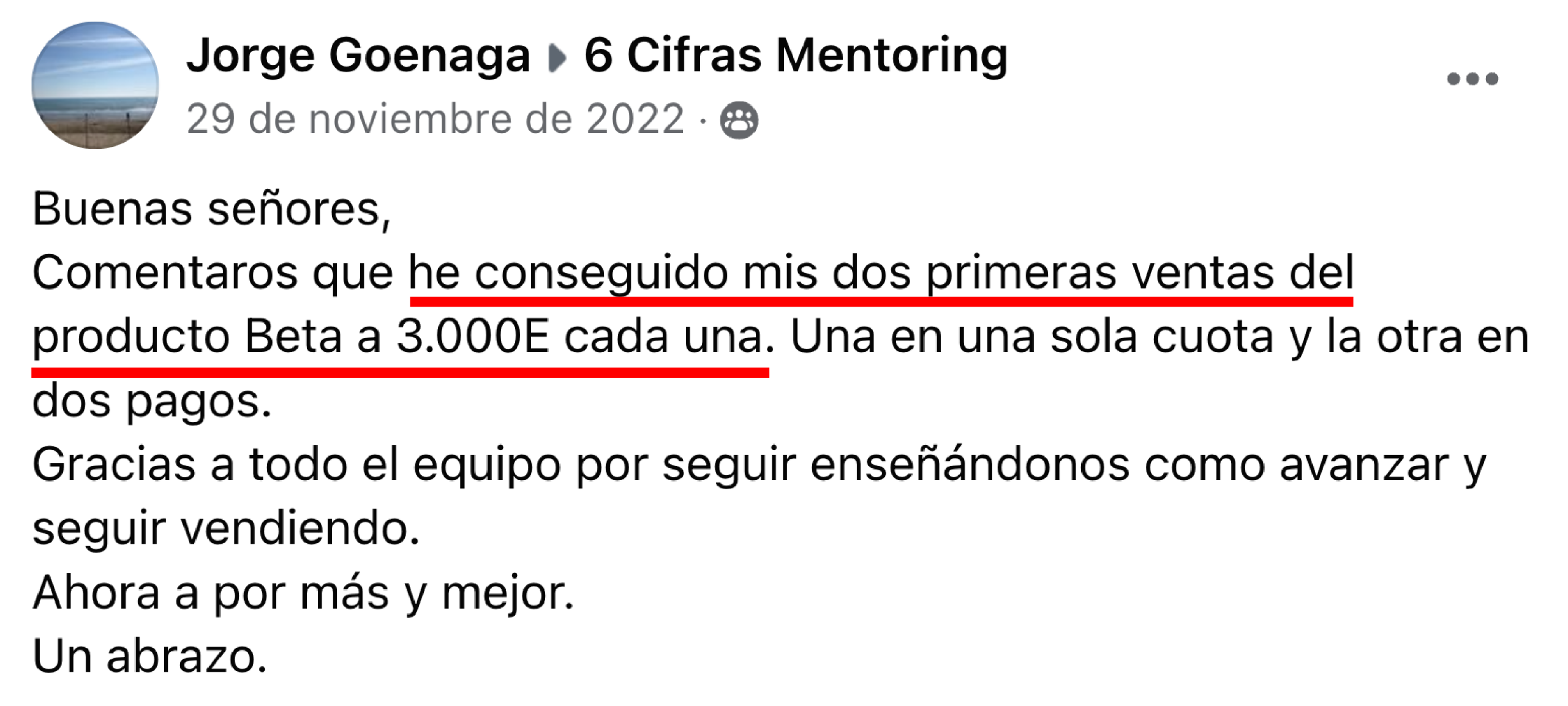 Solo en 20 días desde que validamos la idea y puso en marcha el programa y las llamadas, consiguió generar 6.000 € cerrando sus dos primeras ventas sin inversión en publicidad.